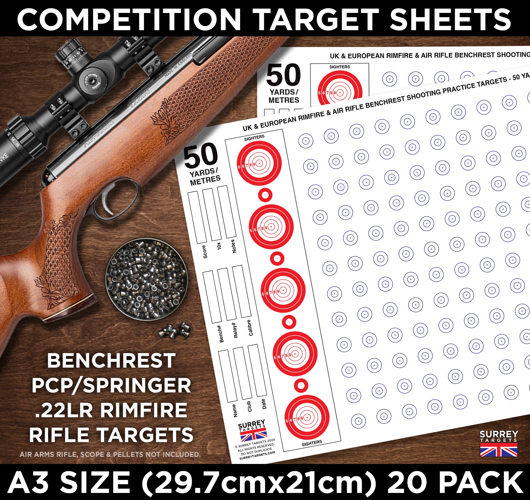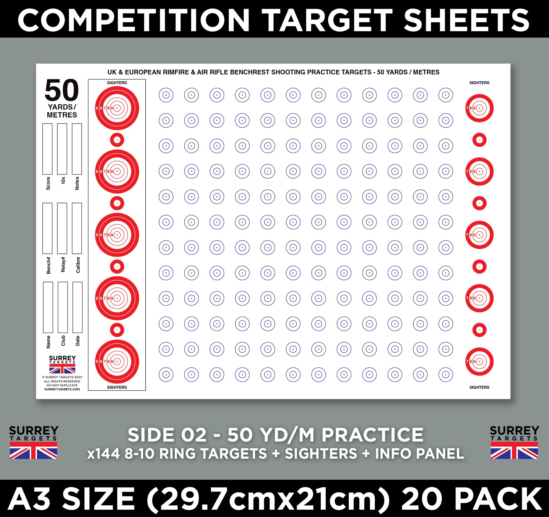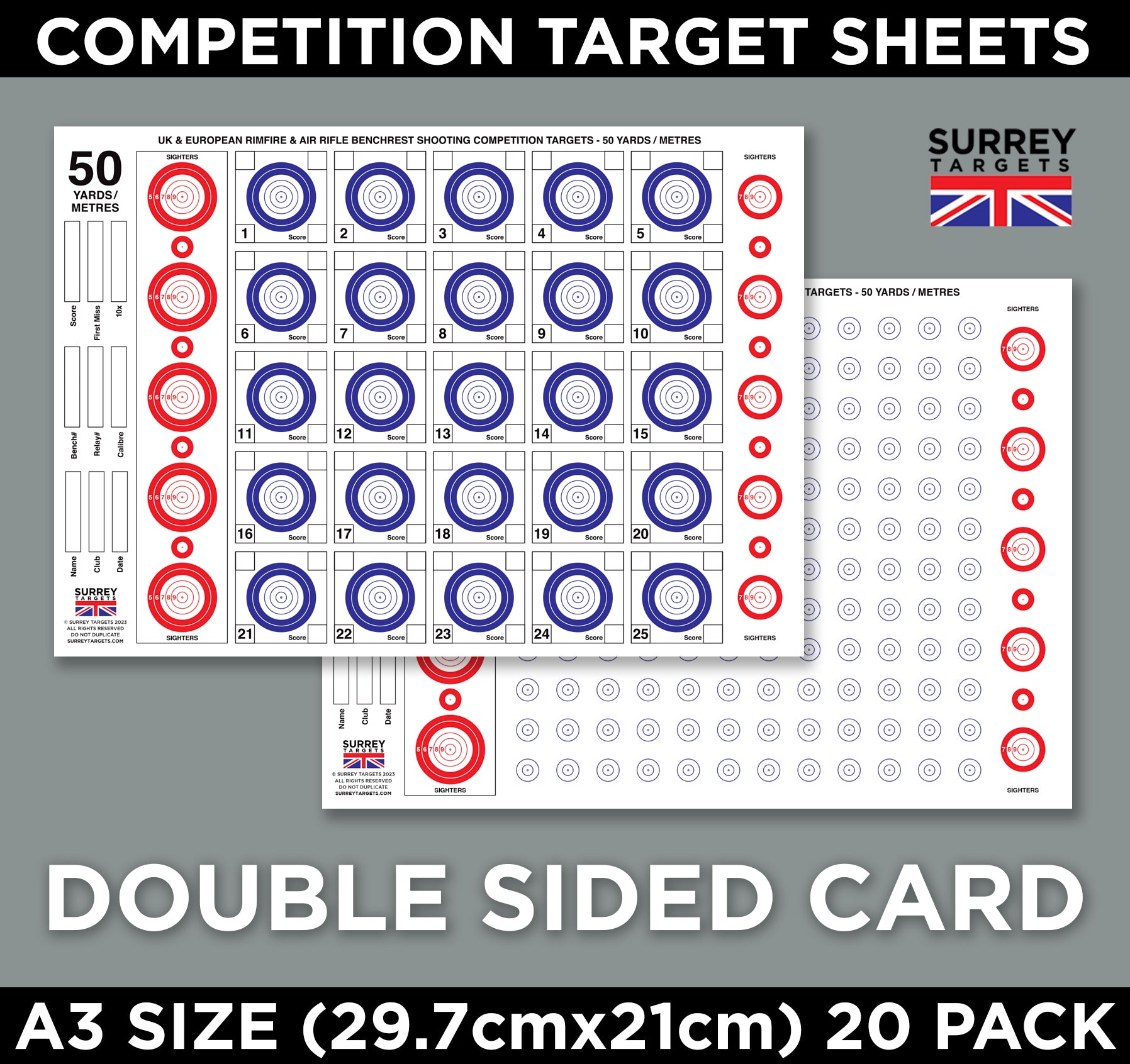 Competition & Practice Targets Sheets - Benchrest Rifle 50 Yards/Metres - Double Sided A3 Size - 300gsm - 20 Card Pack